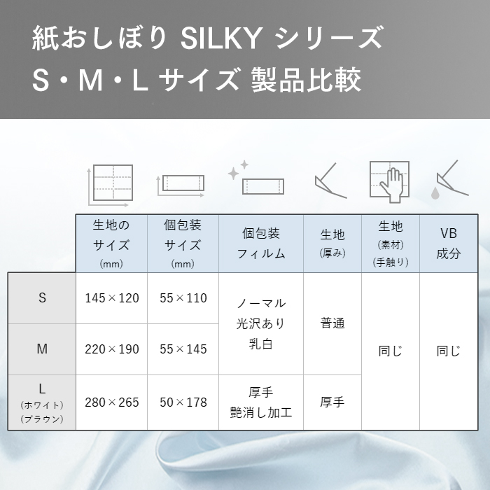 宿泊のお客様の食事用で使っています。ランチでは、通常サイズでもいいですが、夕食などでは、大判サイズでないとダメです。大判サイズはお客様にも好評です。おしぼりの個別包装されているビニール袋の表にメーカーや品名の印字がなく無地なのが気に入って購入を決めたポイントです。他のメーカーは印字はあるのが嫌です。100枚単位で購入できるのが良い。