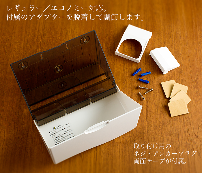 | 使用上の注意 | ※このタオルホルダーはレギュラー・エコノミーペーパーに対応しています。 ※エコノミーサイズのペーパーを使用する時に本体側・カバー側の取り付け穴にはめ込んで使用して下さい。レギュラーサイズのペーパーを使用する時には不要です。 ※箱の側面に取り付け方が記載してあります |