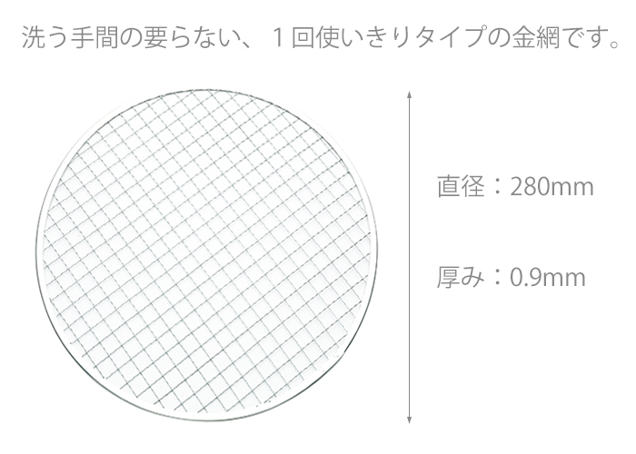 | 特 長 | ●洗う手間の必要ない、使い切りタイプの金網です。 ●焼肉・七輪・BBQなど様々な用途で焼き網としてお使いいただけます。 |
