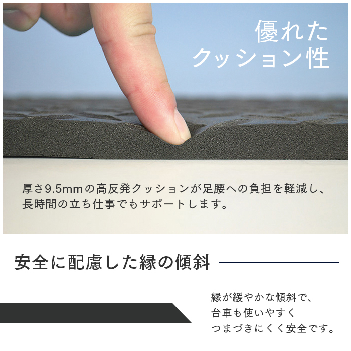 製品の特長 | ●クッション性が高く、長時間の立ち仕事に最適 ●つまずき防止の傾斜付き ●冷気を遮断するので冷え対策に |
