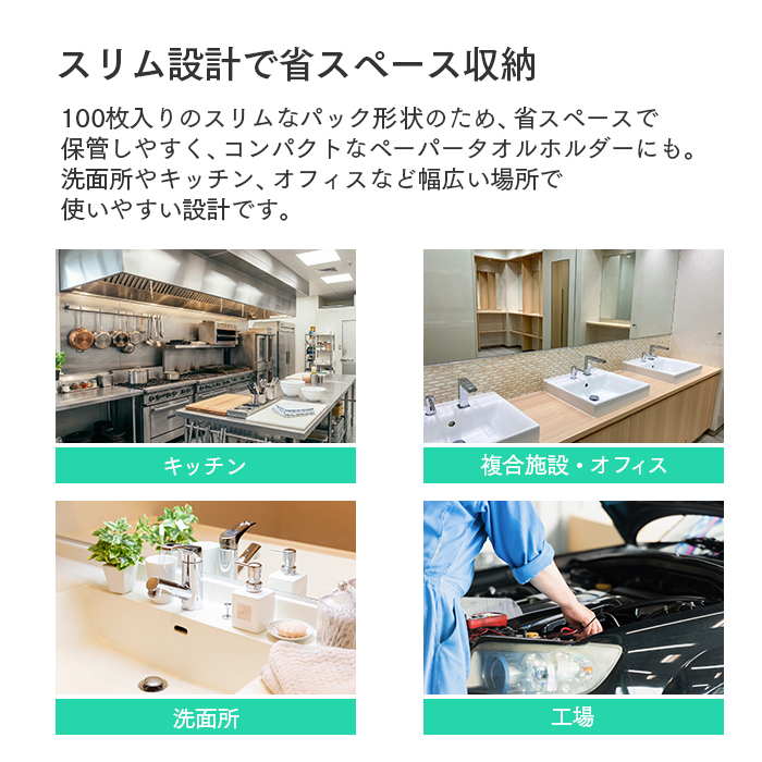 | 商品の特長 | ●再生紙100%のペーパータオル ●ハードタイプで厚手の紙のため、しっかりと拭き取ることができます。 ●100枚入のスリムなパック形状 ●小さいホルダーにも入れることが出来ます |