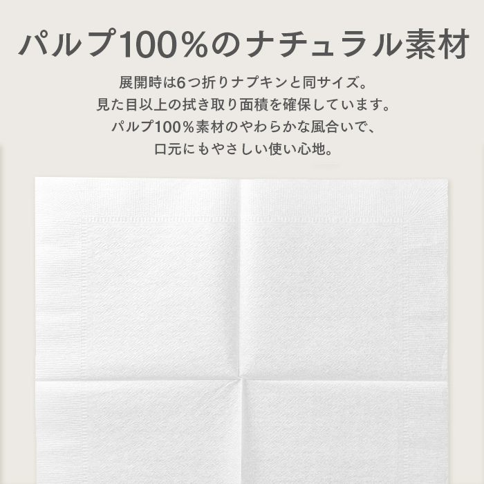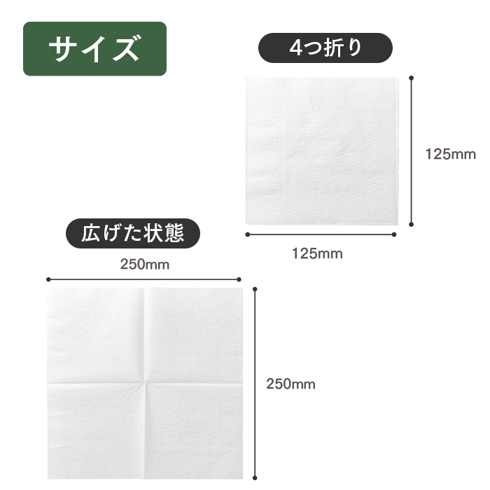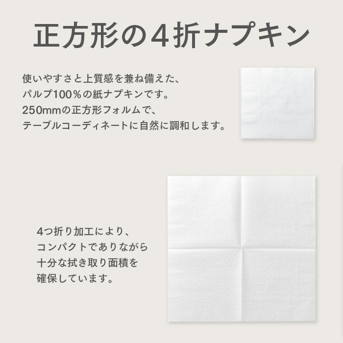 | 商品の特長 | ●飲食店やカフェ、イベントなどで使える業務用ペーパーナプキン ●4つ折り仕様でコンパクトに収納・配布しやすい ●広げると約25cm四方の使いやすいサイズ ●使い捨てタイプで衛生的 ●レストラン・給食・フードコート・イベントなど幅広いシーンで使用可能 |