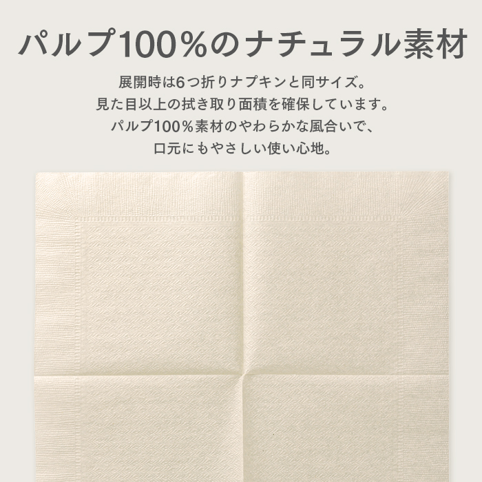 | 商品の特長 | ●ナチュラルな風合いの未晒し色のペーパーナプキン ●飲食店やカフェ、イベントなどで使える ●4つ折り仕様でコンパクトに収納・配布しやすい ●広げると約25cm四方の使いやすいサイズ ●使い捨てタイプで衛生的 ●レストラン・給食・フードコート・イベントなど幅広いシーンで使用可能 |