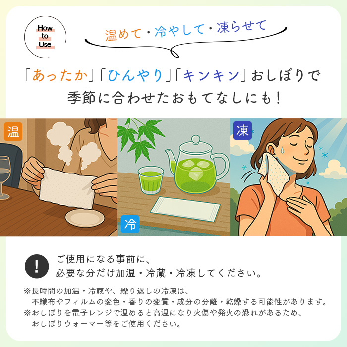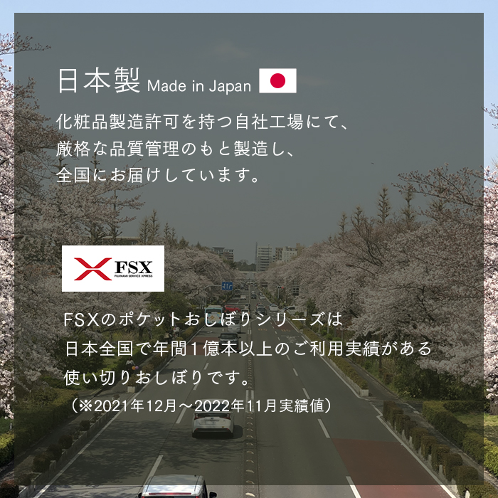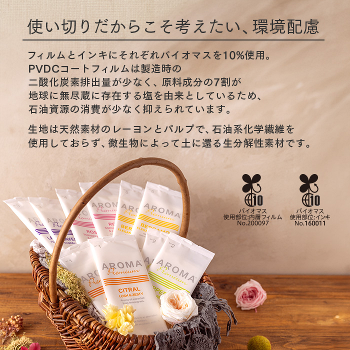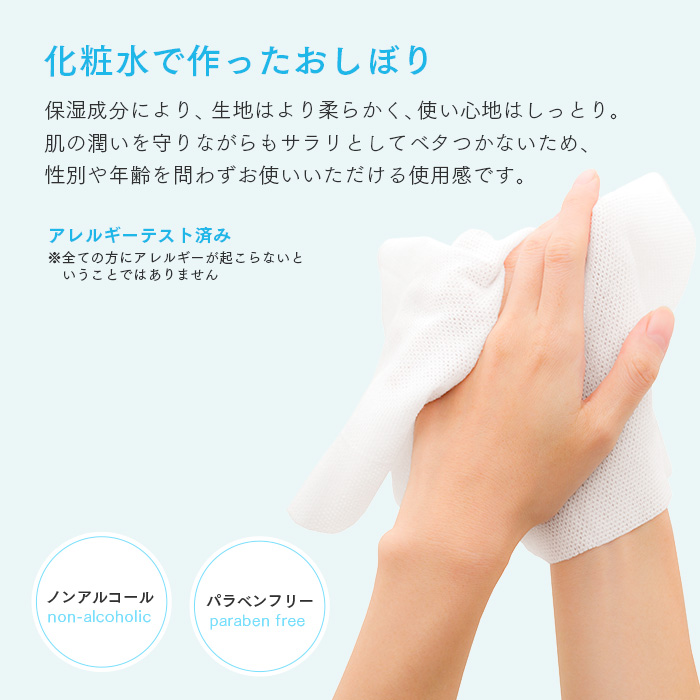 | 商品の特長 | ●アロマオイルを配合した香り付きのおしぼり ●布のような厚みで、しっかりとした使い心地の国産原紙を使用 ●植物由来の素材を水の力で絡ませた原紙は、環境にも肌にも優しいおしぼり(素材は生分解性で肌にも優しい) ●外装フィルムは環境に配慮したバイオマス10%配合。 ●保湿成分により、しっとりサラッとした使い心地になっています。 |