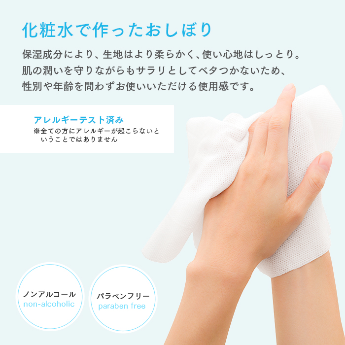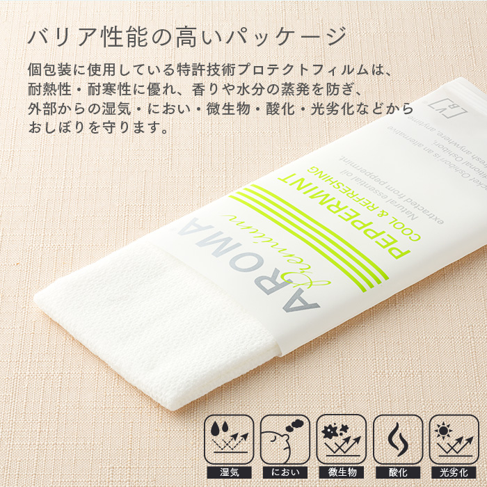 | 商品の特長 | ●アロマオイルを配合した香り付きのおしぼり ●布のような厚みで、しっかりとした使い心地の国産原紙を使用 ●植物由来の素材を水の力で絡ませた原紙は、環境にも肌にも優しいおしぼり(素材は生分解性で肌にも優しい) ●外装フィルムは環境に配慮したバイオマス10%配合。 ●保湿成分により、しっとりサラッとした使い心地になっています。 |
