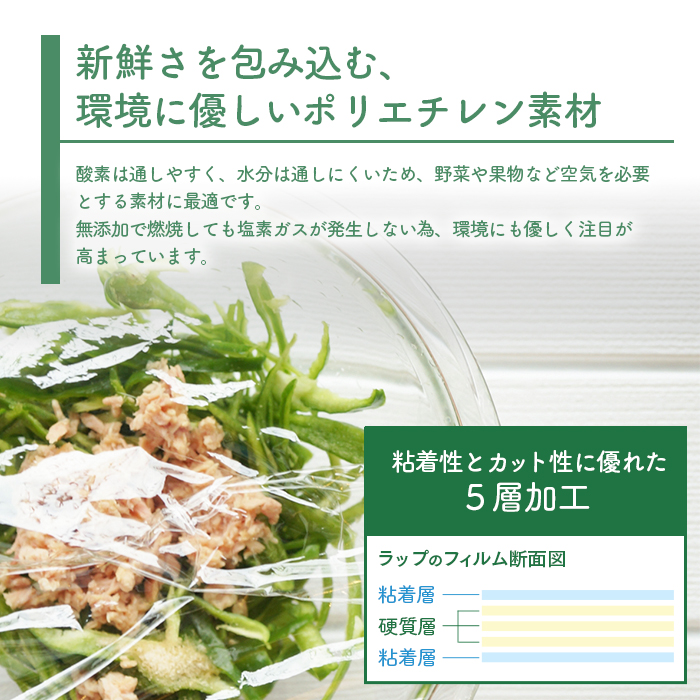 | 商品の特長 | ●粘着性とカット性に優れた5層加工のポリエチレン製ラップ ●無添加であり、 燃焼しても塩素ガスが発生しない為、環境にも優しい商品です ●食品衛生規格合格品 |