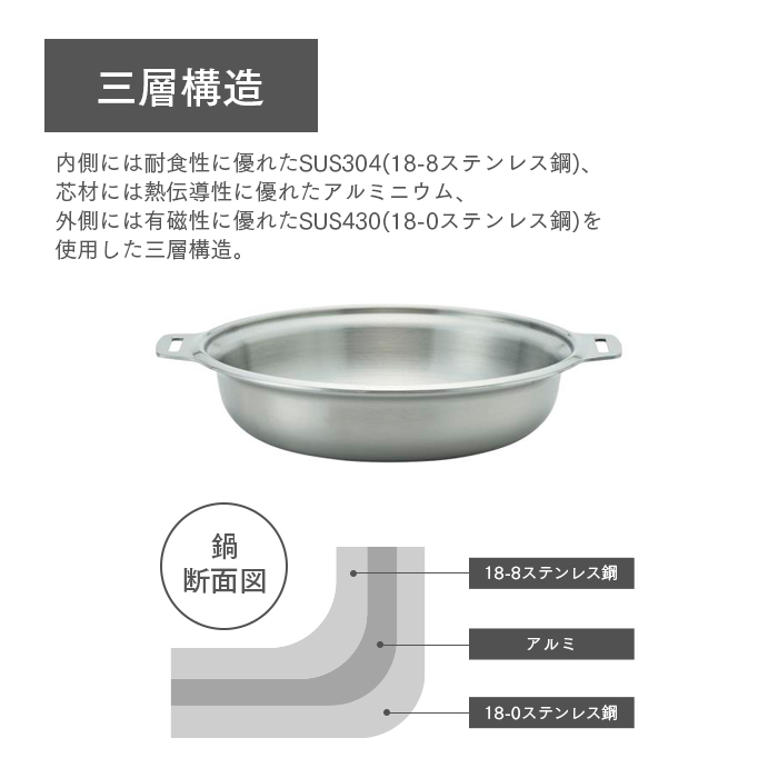 | 商品の特長 | ●熱効率に優れた独自の三層構造により、よりおいしく調理できる鍋です ●IH対応 |