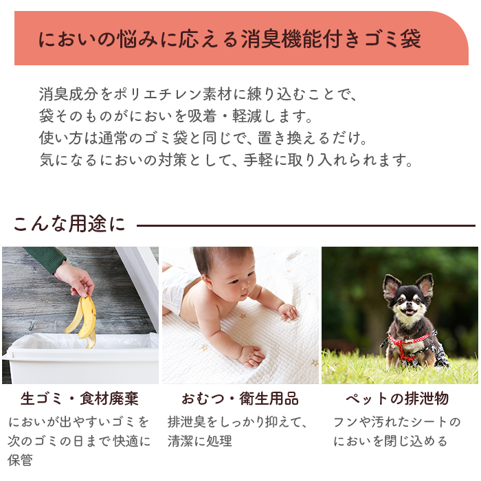 | 商品の特長 | ●消臭成分を素材に練り込み、袋の内側からにおい成分を吸着。生ゴミ臭・腐敗臭・タバコ臭・排泄臭に対応します。 ●安全性の高い無機素材を使用し、消臭成分は酸化ケイ素・酸化亜鉛(食品添加物・化粧品にも使用される物質)。 ●0.025mm の厚手タイプ。しっかりした厚みで、重いゴミや濡れたゴミにも耐えやすい仕様です。 ●白半透明で中身が見えにくく、衛生ゴミや生ゴミを目立たせずに処理できます。 |